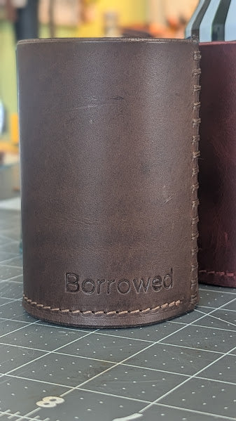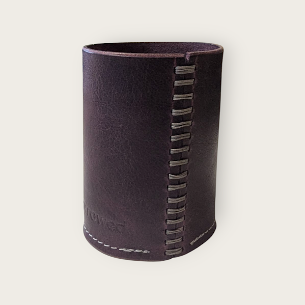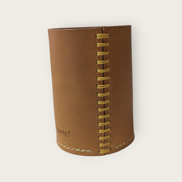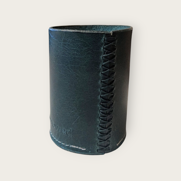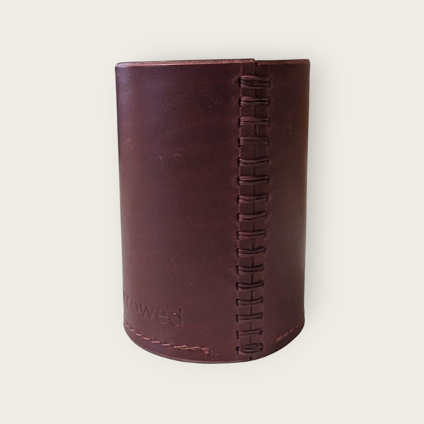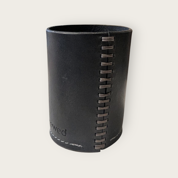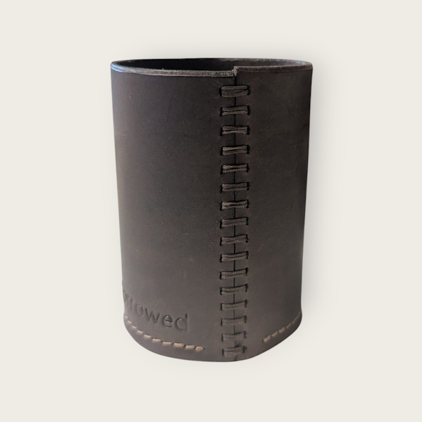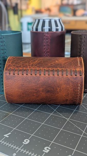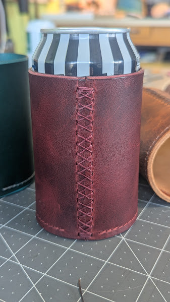 Drink sleeve for cans, made from leather. Hand stitched on seam.
